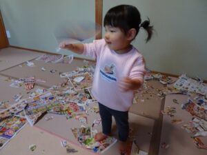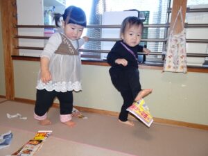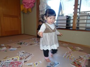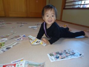 チラシの上をハイハイで移動したり、、
