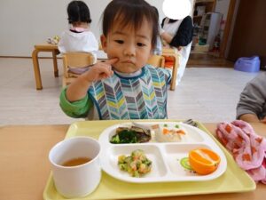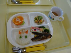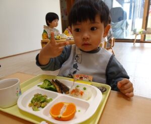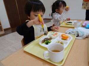 給食はプレイルームでみんなで食べました![]()