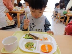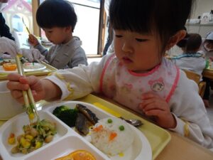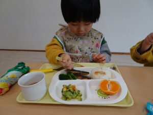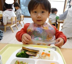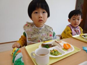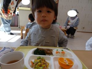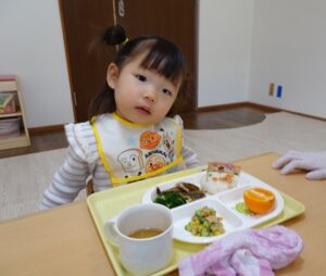 給食はプレイルームでみんなで食べました![]()