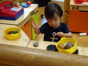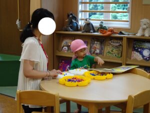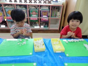 今日のきりんぐみさんは、お部屋で粘土遊びを楽しんでいました