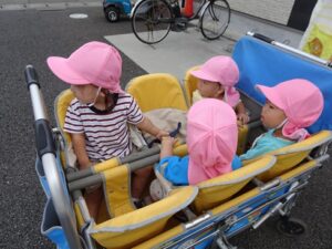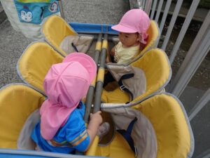 いつもは乗れないお散歩車に嬉しそうな2人でした