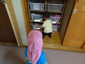 自分のお帽子を片付けているよ