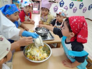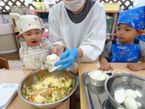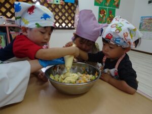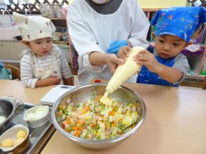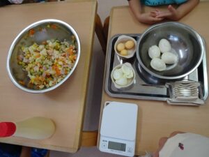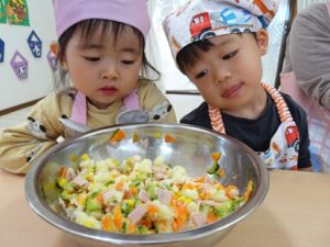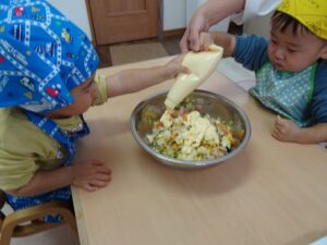 みんなが潰したじゃがいもにハムときゅうり、人参、コーンが加わって、、