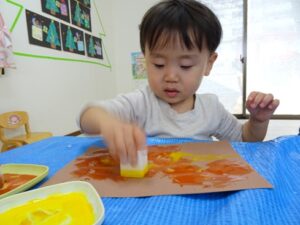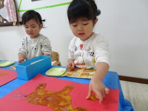 ①お馬さんの体になる画用紙にスタンプをおします![]()