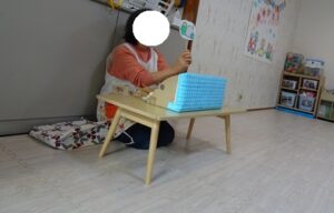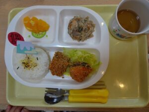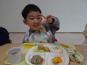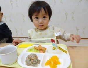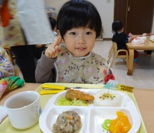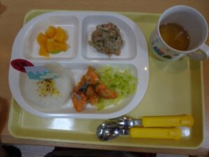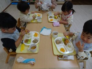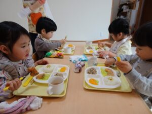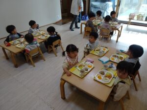 給食はプレイルームでみんなで食べました![]()