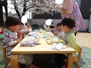 今日の給食はお花見しながら食べますよ~![]()