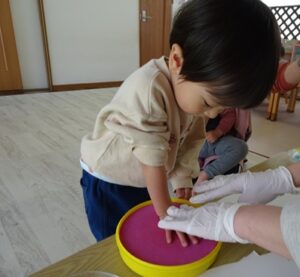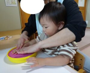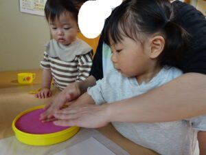 お友だちがすべり台していると同じようにすべったり、砂場のお皿を持っていると同じお皿を持ったりしていました![]()